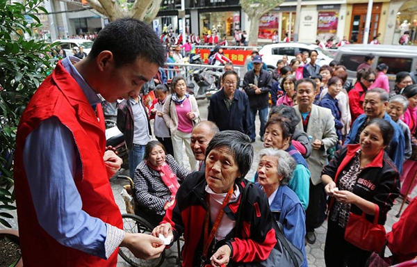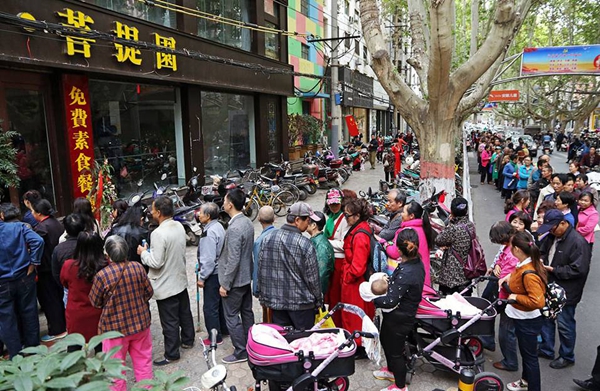 2016年10月11日,河南省郑州市首家免费素食自助餐厅门前,百余名大爷大妈排起了十多米的长队,等待享用免费的午餐。