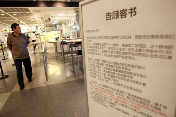 上海宜家徐家汇店的餐厅每逢周二周四,就迎来大批的中老年相亲团,这个现象在2011年就颇具规模,这群带着交友目的的顾客长期占据宜家餐厅的大半座位,自泡茶水、外带餐食、领取免费咖啡、更有个别者大声喧哗、随地吐痰,甚至打架斗殴,对其他顾客或工作人员出言不敬更有甚者诉诸暴力,严重影响了餐厅的用餐环境,宜家对此也头疼不已,引导规劝的工作以及餐厅分区的做法也收效甚微,终于在近日出具公告,明确提出“先购餐、后入座”的规定,餐厅只对用餐顾客提供服务。
