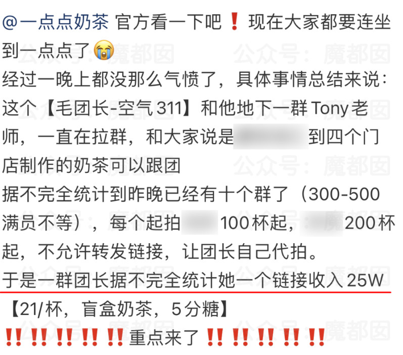 根据众多团长的统计,这个团购链接一次性收入将近25w。由于受到不公平待遇,有人@一点点奶茶官方。