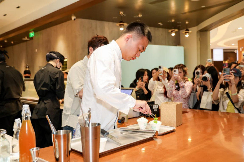 在广州天环广场LAB店的“灵感茶话会”活动中,除了喜拉朵新品,喜茶还带来了活动限定特调饮品莫吉托特调,通过融入绿妍茶汤,在清新爽冽的经典莫吉托风味之中,呈现出沁人茶香。燃少更现场展示调制手艺,为来到喜茶的观众还原《一饭封神》中“莫吉托仙人”的出圈场景。在邀请大家品尝新品的同时,燃少还特别介绍了燃·莫吉托喜拉朵及特调中的产品灵感,“和节目中不同的是另外增加了茶香,是对莫吉托的另一种表达,希望给大家带来自然、干净的感受。”