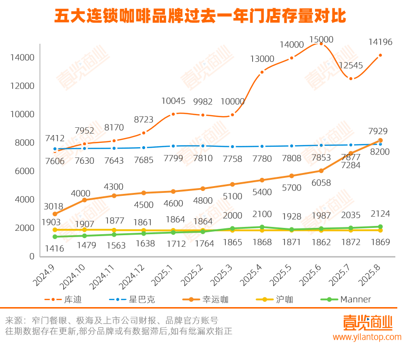 值得注意的是,据壹览商业数据,连锁咖啡行业门店门店分层明显,瑞幸、星巴克、库迪、幸运咖构成第一梯队,门店数量均超过7000家,马太效应持续加剧。其中,瑞幸咖啡以27814家门店断层领先,占总量的39.5%,规模壁垒稳固,并在高基数下保持稳健增长。库迪咖啡位居第二,门店数在1.5万家左右;幸运咖成功超越星巴克升至第三,印证其下沉策略的有效性。