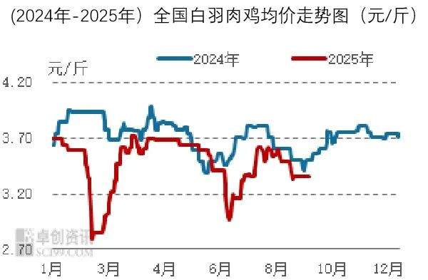 2025年9月,白羽肉鸡均价为3.39元/斤,较上月下滑0.16元/斤,跌幅4.51%,较去年9月下滑0.13元/斤,跌幅3.69%。