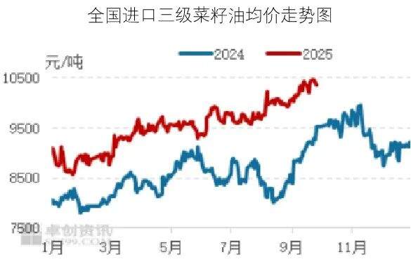 2025年9月,国内进口菜籽油现货价格整体呈现震荡上行走势,整体均价环比上涨。截至9月28日,本月各地区进口三级菜籽油现货均价为10199元/吨,较上月上涨265元/吨,涨幅为2.67%。