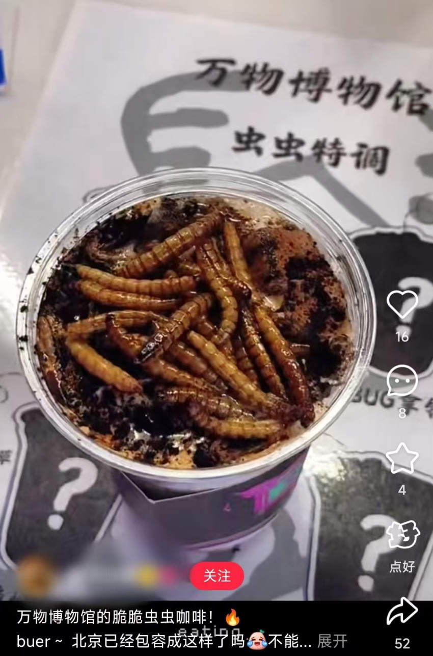 最近,北京一家昆虫博物馆推出的“蟑螂咖啡”在社交媒体上引发热议。相关视频显示,这款咖啡上浸泡着大量焦黄的大麦虫,甚至能看到完整的深褐色蟑螂,奶泡上的褐色粉末更是现磨蟑螂粉,视觉冲击力十足,让网友直呼“炸裂”。