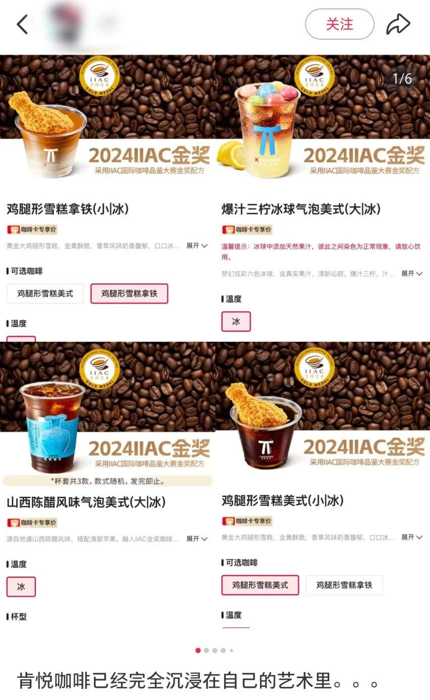 肯悦咖啡也在今年创意咖啡的风潮下持续发力,甚至被网友调侃“已经完全沉浸在自己的艺术里”。据了解,今年以来,肯悦咖啡已陆续上线过山西陈醋风味气泡美式、吮指原味鸡风味拿铁、五仁蛋挞拿铁、万事大吉汤圆加朵浪漫等多款创意咖啡。其中山西陈醋风味气泡美式凭借大胆搭配,仅在小红书平台就有超29万篇相关帖子,讨论热度居高不下。