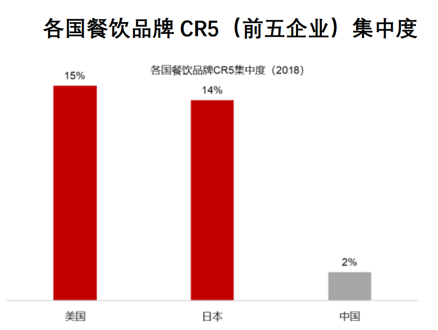 中国连锁经营协会发布的《2021年中国连锁餐饮行业报告》则指出,中国餐饮品牌CR5(前五企业集中度)仅为2%,而美国和日本CR5分别达到15%和14%。