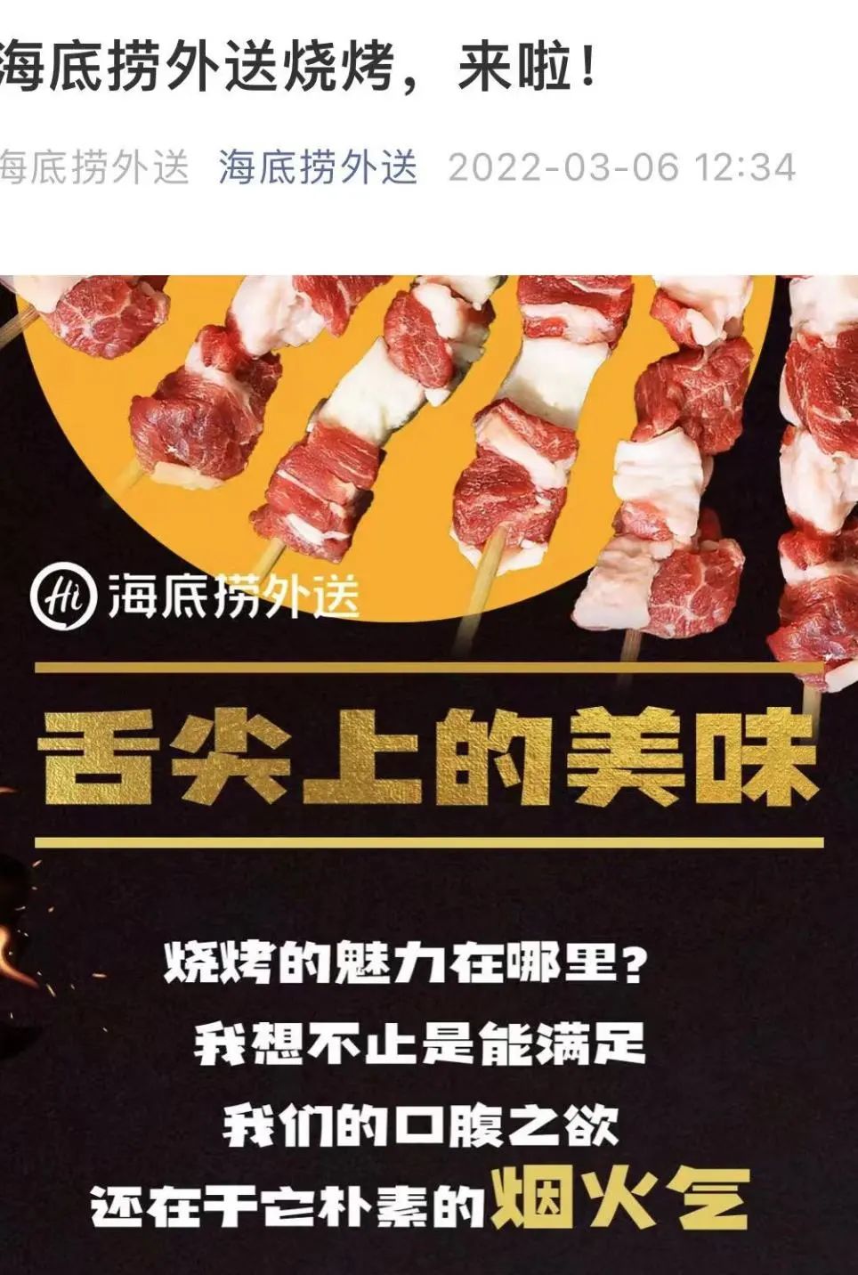 3月6日,海底捞突然宣布将开启烧烤食材外送业务上线,目前该业务已在北京、成都等部分城市的海底捞门店推出,其他城市也在陆续开放中。