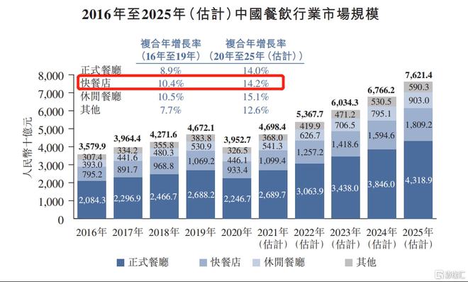 值得一提的是,在当下生活节奏愈发加快的背景下,快餐业这一细分领域未来的发展更值得关注,其增速在过去几年领跑全行业,且据弗若斯特沙利文测算,在2020年至2025年间预计复合增速将达到14.2%,依旧会引领餐饮业向上发展。