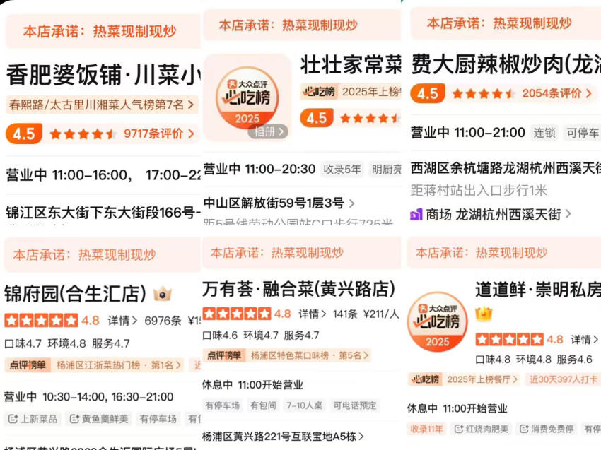 ▲已有餐饮门店线上页面出现“热菜现制现炒”承诺展示。图源:美团App、大众点评App