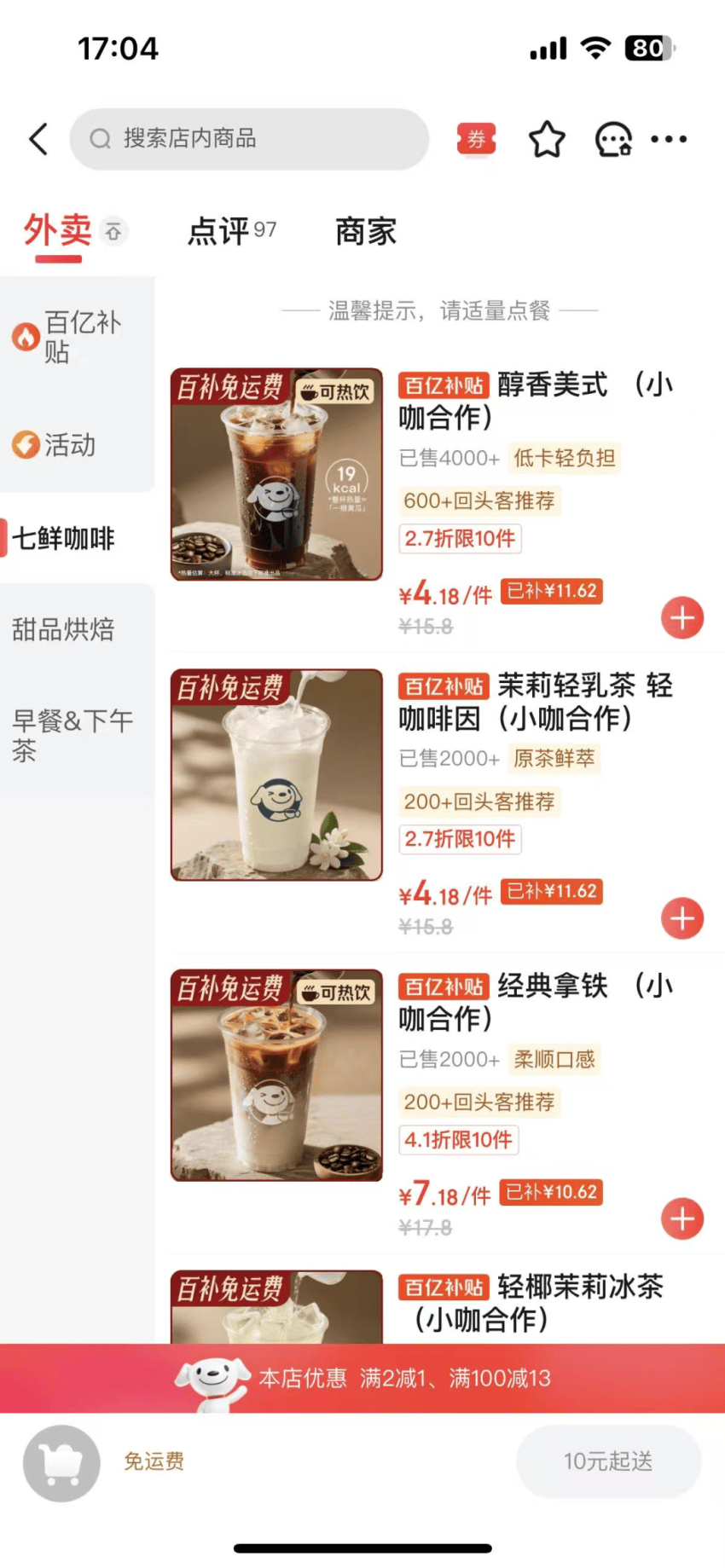 从产品看,七鲜咖啡的产品体系主要分:咖啡、甜品烘焙及早餐下午茶套餐,其中咖啡品类涵盖美式、拿铁等品类,分别有醇香美式、茉莉轻乳茶、轻椰茉莉冰茶、鲜奶拿铁、茉莉花香拿铁、生椰拿铁、椰青美式、双杯美式;甜品则有黄油提子司康、法式扁桃仁焦糖酥等热门烘焙面包产品。咖啡的定价仅为9.9元。但是在促销期间价格更低,只有5元到7元。比瑞幸和库迪更便宜。