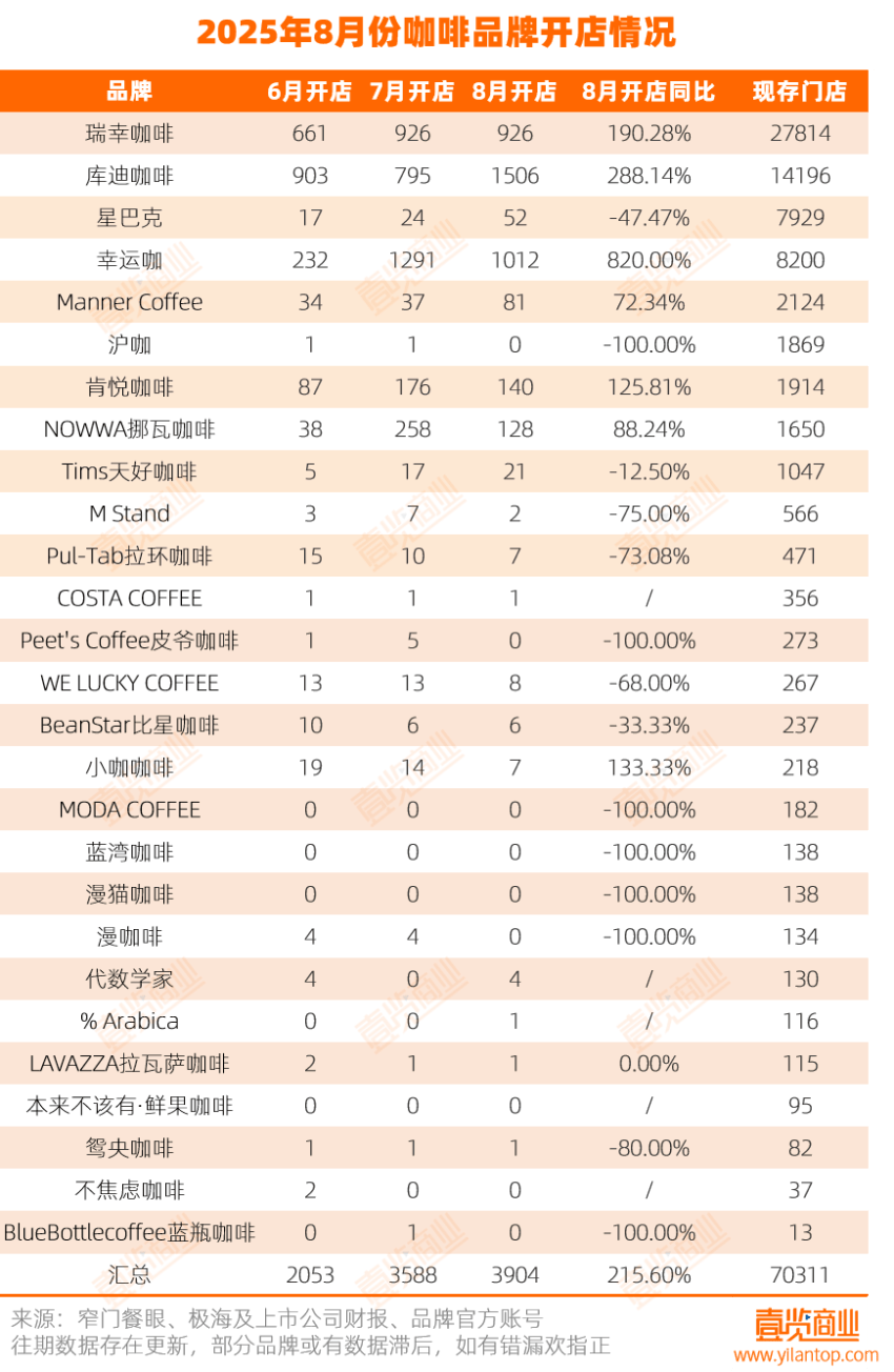 壹览商业数据显示,小咖咖啡6、7、8三个月分别开店19家、14家、7家,截至2025年8月底全国范围拥有门店218家。